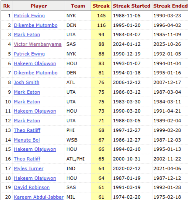 文班已连续88场常规赛至少1次封盖, 与尤因并列历史第四